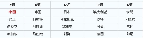 綜上所述,A組中包括中國,約旦、伊拉克以及新加坡。B組是韓國、科威特、阿聯酋以及黎巴嫩。C組是日本、烏茲別克斯坦、敘利亞以及朝鮮,D組是澳大利亞、沙特、阿曼以及泰國,E組是伊朗、卡塔爾、巴林以及印尼。