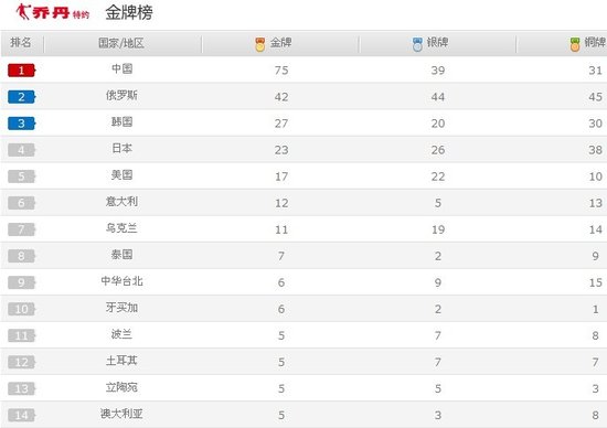 中國代表團本次大運會堪稱“吸金王”,21日比賽結束后,中國軍團以61金、35銀、28銅領跑大運會獎牌榜,距離打破69金的大運會金牌紀錄并不遙遠。大家都在期待著中國代表團能創造新的奇跡。僅僅一天時間,中國代表團的運動員們就將這種期待化為現實:在射擊、跳水、跆拳道、藝術體操等項目中,中國隊再次斬獲14金,已經超越了前蘇聯在1973年大運會上創造的69金的驚人紀錄。目前中國隊已經成為歷屆大運會上,單屆比賽奪金最多的隊伍。1973年蘇聯以134塊獎牌收官,中國代表團目前獎牌總數已經達到145塊,這次大運會我們已經全面超越了以往大運會單屆比賽金牌、獎牌紀錄,成為了最耀眼的隊伍!