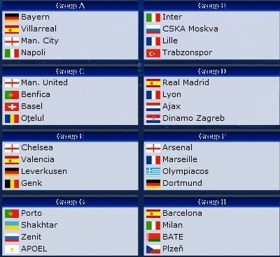 截止8月25日凌晨,歐冠32強球隊全部產生,來自18個國家和地區的歐冠列強根據歐冠積分被分為四個檔次。抽簽遵循的基本原則如下:其一,每檔次抽出一隊,與其他三個檔次中抽出的一隊分成一個小組,32強合計被分為8個小組,每個小組進行兩回合主客場雙循環比賽,小組前兩名可以晉級歐冠16強;其二,來自同一個足協的球隊彼此回避(比如國際米蘭不可能碰到AC米蘭,曼聯不可能碰到曼城)。