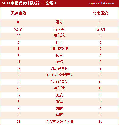 最終全場比賽在補時2分鐘后結束,天津泰達隊在主場0-1不敵北京國安,這是他們自09賽季客場輸球后,首次不敵國安。本輪過后,泰達已經(jīng)7輪不勝。