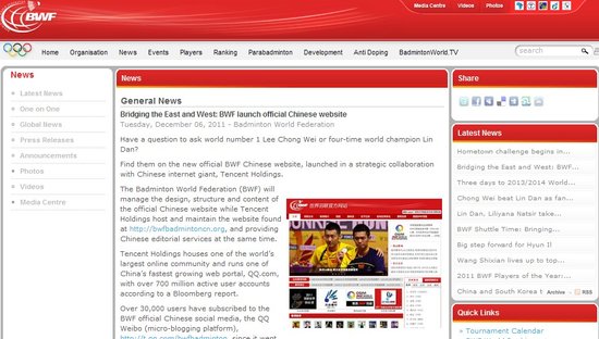 騰訊體育訊 北京時間12月7日消息,世界羽聯宣布與中國瀏覽量最大的中文門戶網站騰訊成為戰略合作伙伴,雙方合作的世界羽聯中文官方網站(http://bwfbadmintoncn.org)將正式上線。屆時,中國網友不僅可以輕松瀏覽世界羽聯的新聞,還能第一時間通過騰訊微博與林丹、李宗偉等巨星交流。以下是世界羽聯公告全文: