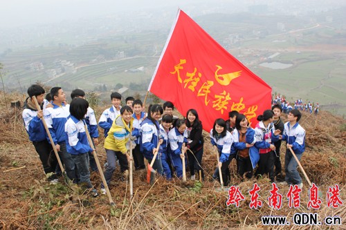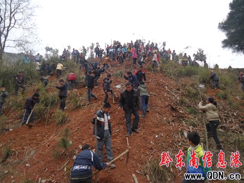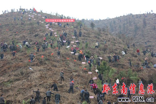縣屬機關單位義務植樹地點在鳳城鎮雷寨村懶板凳坡和小沖坡,3月12日,在該縣綠化委的統一安排下,縣委、縣政府、人大、政協、教育局等97個單位2120多人上山參加植樹活動,其中天柱縣民中、二中團員學生參加人數達300余人,大家不怕苦不怕累,人人為美化家園,改善生態環境,建設生態文明獻力,按照指定地點認真完成自己的栽樹任務。據統計,當天栽香樟、杜英等樹6370多株。(龍勝洲)