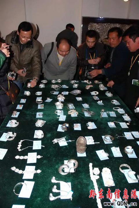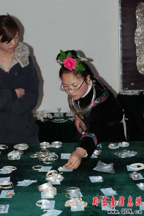本港訊 (特約記者 陳沛亮 攝影報道)2009年11月21日,雷山縣西江鎮控拜村舉行銀飾技藝傳承表演,村里的100余名銀匠現場進行銀飾鍛造的精湛表演,同時展出千件精美絕倫的銀飾,吸引了各地客人前來參觀和購買。控拜村是國內有名的苗族“銀匠村”, 全村有100多戶苗族群眾從事銀飾鍛造業。圖為11月21日,雷山縣西江鎮控拜村的銀匠在制作銀飾,展出的銀飾和游客在雷山縣西江鎮控拜村選購銀飾。