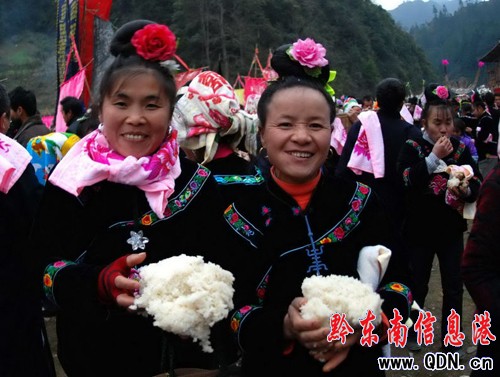 兩名參加跳木鼓舞的苗族女子在蘆笙場得到免費發(fā)放的糯米飯