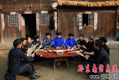 本港訊 (特約記者 黃曉海)2010年1月16日,丹寨縣興仁鎮臺辰村的苗族村民們利用冬日農閑時期聚集在一起學習苗族傳統文化“賈理”。苗族“賈理”是苗族口傳心授的一種傳統文化,是苗族先輩留給后人最為重要和深具代表性的非物質文化遺產,是苗族文學、史學、哲學、法學、民俗學、自然科學、巫學、語言學的綜合集成,是苗族古代社會的“百科全書”。幾乎薈萃了苗族民間文學的所有藝術手法,是苗族民間文學藝術中的一枝奇葩。《苗族口頭經典“賈”》在2007年入選為第二批國家級非物質文化遺產名錄。