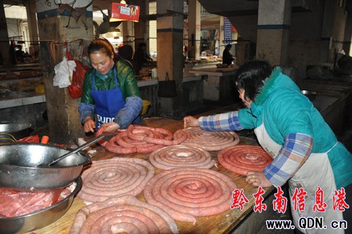 圖為1月16日,三穗縣農貿市場內一家肉販正在幫市民裝香腸。