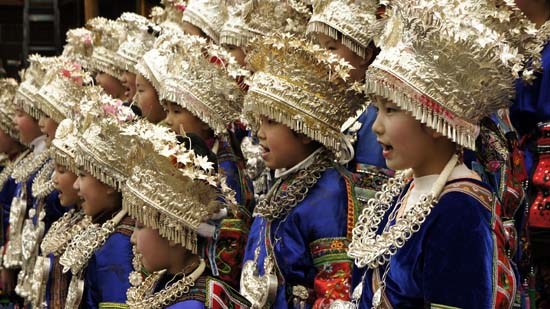 苗族姑娘們戴著高約20厘米的制作精美的銀花冠,花冠前方還插有高低不齊的銀翹翅,她們站在一塊兒唱歌,即匯聚成銀光閃閃的美麗景象。與小黃侗族姑娘的素色布褂相比,苗族姑娘們的大花衣色彩鮮艷、圖紋精致,花色品種多,可謂“花衣銀裝賽天仙”。
