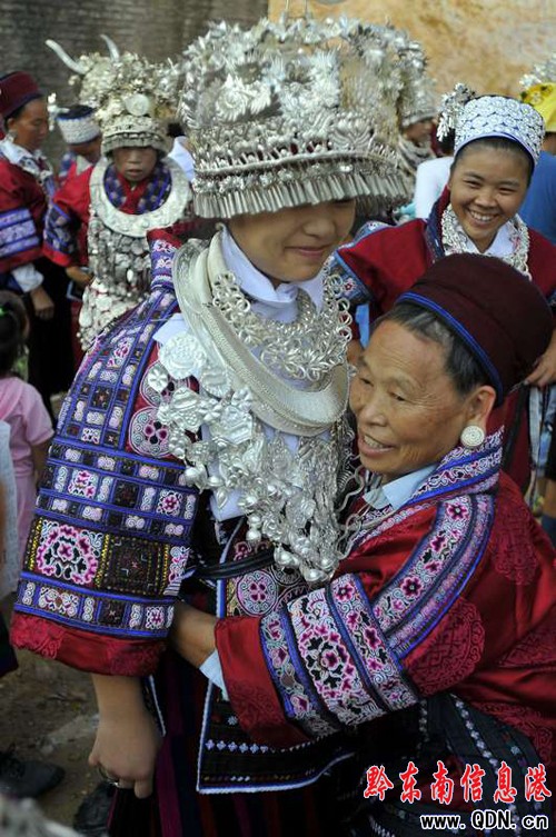 8月13日,身著節日盛裝苗族女子在臺江縣革一鄉屯上村參加“七月半” 踩鼓比賽。