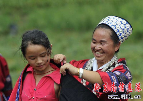 8月13日,一名苗族女子在臺江縣革一鄉屯上村參加“七月半” 民族節期間給女兒打扮。