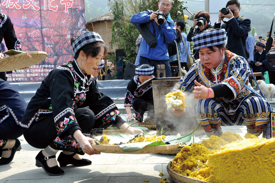 3月24日,上萬名各族同胞在貴州省望謨縣王母廣場歡度布依族“三月三”。圖為人們分享剛出爐的五色糯米飯。 杜再江攝