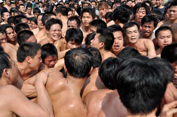 3月24日,廣西三江侗族自治縣富祿鄉(xiāng)舉辦第128屆“三月三”花炮節(jié)。圖為“搶花炮”運動員爭搶花炮。 吳練勛攝