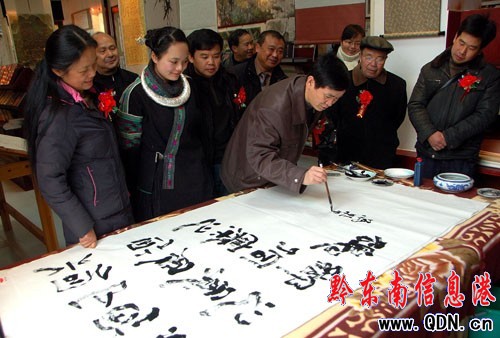 本港訊 (記者 李麗娟 攝影報道)2月5日,書畫家們齊聚黔東南州民族博物館為該館給他們提供的“黔墨軒”書畫展示展銷平臺而即興潑墨祝福。