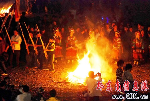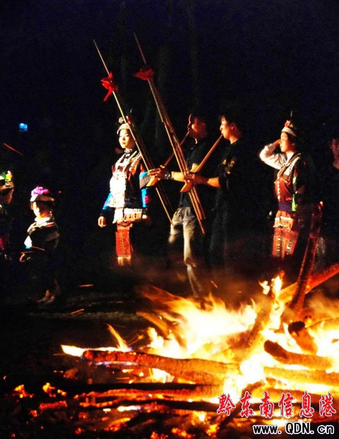 本港訊 (特約記者 陳沛亮 攝影報(bào)道)2月28日晚,是凱里市舟溪鎮(zhèn)苗族同胞進(jìn)行接蘆笙祭祀活動(dòng)的日子,當(dāng)?shù)財(cái)?shù)千名苗族群眾圍在3堆燃燒篝火的甘囊香蘆笙場(chǎng)上,跳起簡(jiǎn)樸、自然、熱烈、歡快的蘆笙舞,拉開“甘囊香”蘆笙節(jié)的帷幕。根了解,“甘囊香”蘆笙節(jié)從2010年2月28日開始至3日5日結(jié)束,歷時(shí)6天。圖為:2月28日晚,苗族同胞在凱里市舟溪鎮(zhèn)甘囊香蘆笙場(chǎng)的篝火旁跳蘆笙舞。