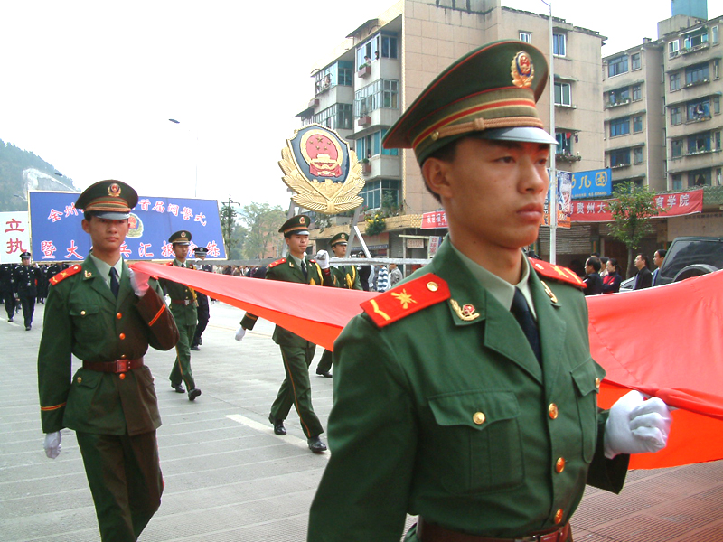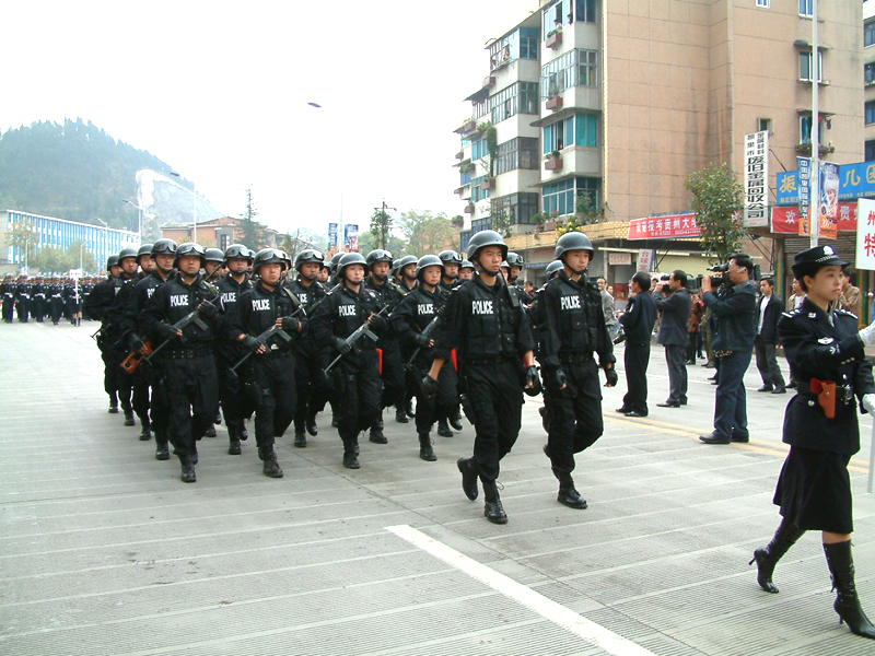 l2時50分各方隊在永華路州公安局路口列隊完畢。列隊川頁序按照摩托車護衛隊(呈三角形開道)、開道警車l車、新式警車10輛、國旗護衛隊、國徽盾牌、特警、交警、消防支隊、凱里市公安局……