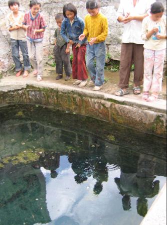 本港訊 (吳如雄 攝) 8日,幾位小朋友在一眼井泉邊擊掌歡呼。在貴州平壩縣城郊有一口名叫“珍珠泉”的井泉,明代旅行家徐霞客贊其為“圣泉”。游人站在泉井左邊鼓掌頓足,左邊的泉水冒泡并涌出團團水珠;在右邊鼓掌,右邊亦然,好似在歡迎客人。據地質學家解釋,這是由“聲震”造成的現象,與復雜的地質構造有關。
