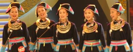 在剛剛結束的“黃果樹”杯首屆“多彩貴州”歌唱大賽中,楊麗和她的姐妹們發揮出色,以悠揚婉轉的歌聲和濃郁的民族風情,一舉奪得民間唱法“銀瀑獎”和優秀獎兩個獎項。在8月7日舉行的頒獎晚會上,省委常委、貴州大學黨委書記龍超云向全省16名年輕優秀選手頒發貴州大學藝術學院的錄取通知書,楊麗和她的四個姐妹榜上有名,成為“多彩貴州”歌唱大賽首批被省委、省政府保送上大學的選手。圖為楊麗(中)和她的四個姐妹在“多彩貴州”歌唱大賽中。