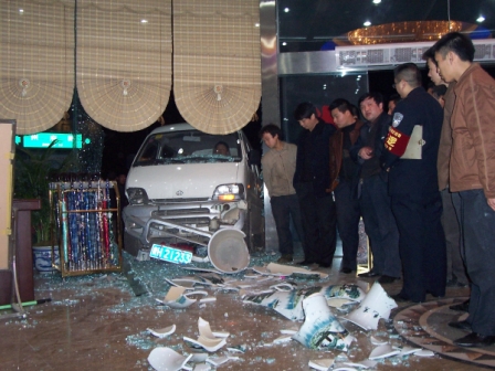 據幾名目擊車禍的出租車駕駛員介紹,凌晨20分左右,肇事面包車從大十字往北京東路駛過來,行至事發處附近時突然失控,先撞向了一輛白色的小車,之后車輛又轉頭撞向了另一輛停放在大酒店門口的綠色出租車,將該出租車的頭部撞出了個缺口。緊接著車輛飛身躍上人行道,向路旁的酒店直奔而去,遇到酒店門口的臺階后,車輛突然飛身而起,往臺階的制高點飛奔而去,只聽“嘩啦啦”的破碎聲,酒店玻璃墻隨聲而降,擺放在大廳內的花瓶也僅接倒下,車頭闖進了大廳。