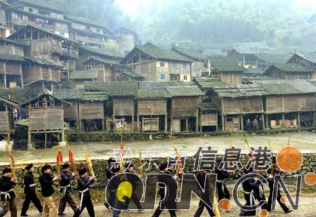 圖:在具有鮮明民族文化特色的地捫侗寨前,一支侗族樂隊(duì)正在演奏(新華社資料圖片)