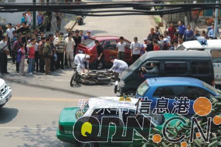 記者聞?dòng)嵹s到現(xiàn)場(chǎng),在韶山南路與老四委之間的三岔口上,紅色轎車停在老四委出口的路中央,摩托車側(cè)倒在一旁,摩托車駕駛員躺在車旁,不停地流著汗水,膝蓋和臉部被擦傷流血。