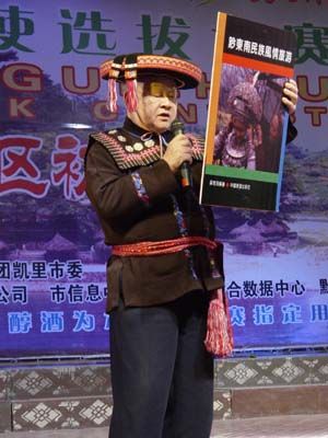 本港訊(肖高飛 記者潘光銀) 3月31日,在“國酒茅臺”杯2006多彩貴州旅游形象大使選拔賽凱里市城區初選賽現場,一位頭戴苗族“帶包帽”,身裝苗族服飾的老大爺格外引人注目,他的才藝表演“一本書,三首歌”贏得了在場觀眾一陣又一陣熱烈的掌聲。這位老人就是原副州長、現年72歲的吳德海。
