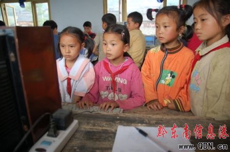 盡管不是真正的電腦,但是這里的孩子們學得特殊認真。記者在微機室里看到,三年級學生吳壽豐及同桌在練習打字,電視機上突然跳出了一個漢字,隨著時間的推移,這個字很快就會“逃離”,接著又跳出了下一個……吳壽豐盯著一閃一閃電視屏幕的現出的第一個字,兩手在鍵盤上揮舞著,幾乎沒有一個字成功“逃離”……記者對準時間,1分鐘過去了,吳壽豐總共打出了30多個字,準確率達到98%。