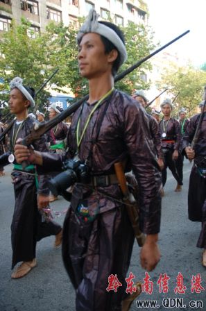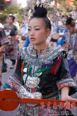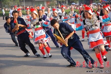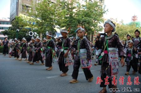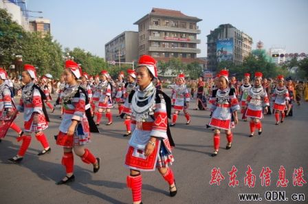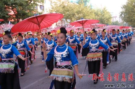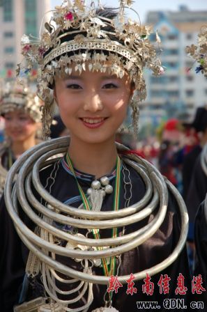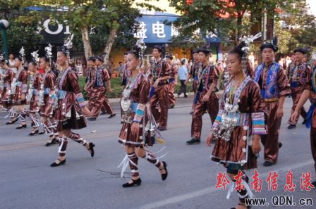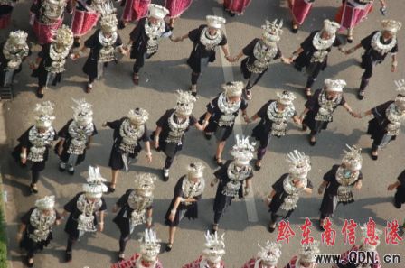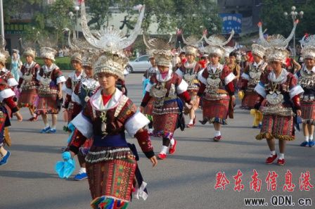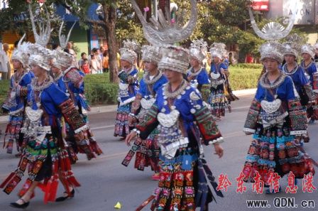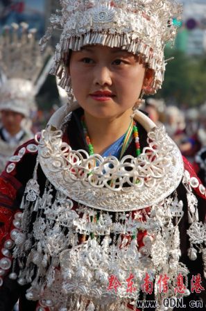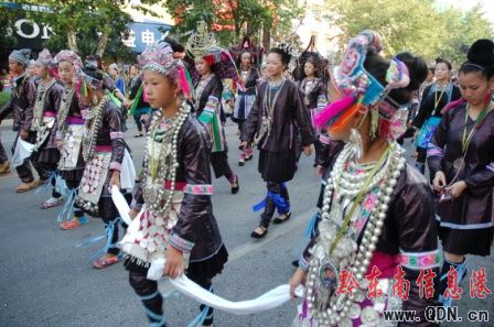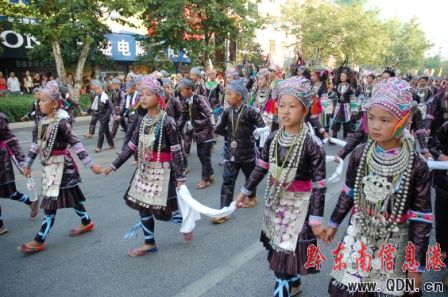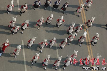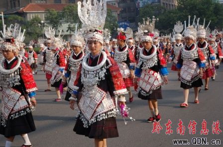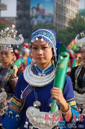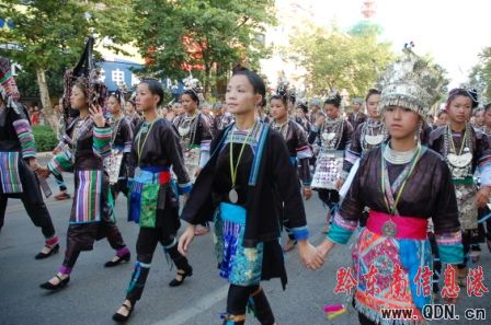 本港訊(記者 潘光銀)7月23日,在貴州省黔東南苗族侗族自治州建州50周年的慶祝活動(dòng)中,當(dāng)?shù)孛缱濉⒍弊宓雀魃贁?shù)民族同胞展示本民族的華麗盛裝,成為一道亮麗的風(fēng)景線。