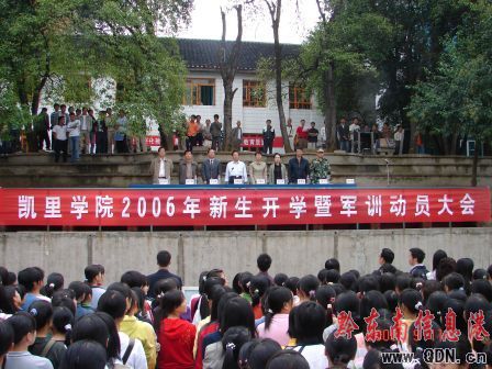 本港訊(張小含 龍安輝報道)9 月11日上午9:00,凱里學院部分黨政領導、州武警教官和2000多名新同學在籃球場舉行首屆新生開學暨軍訓動員大會。 此次大會由凱里學院黨委書記龍則池主持。副校長羅義群在大會上致詞。他說:“凱里學院從7月18日舉行揭牌儀式到今天迎來第一批學生,這都是一個值得紀念的日子。學院老師對新同學的到來表示熱烈的歡迎!”隨后副校長羅義群就學校的指導思想、辦學定位、辦學理念、總體目標、發展重點、師資水平等各方面進行了全面的闡述。接著是凱里學院教師代表和新老學生代表上臺發言,他們紛紛表示辦好凱里學院的決心和信心,絕不丟凱里學院的臉。最后,凱里學院黨委書記龍則池對這次大會作了總結。