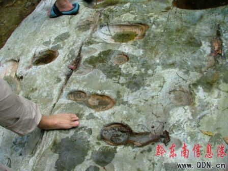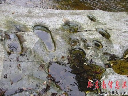 圖片新聞(記者 潘光銀)在雷公山下榕江縣境平陽鄉小丹江村旁一處原始森林瀑布群中,當地旅游部門日前在瀑布河床上,發現了密密麻麻不計其數的“腳印”,“腳印”有大有小。當地人為此景觀取名為“古人腳印”。十一“黃金周”期間,許多慕名到此觀景的游客絡繹不絕。