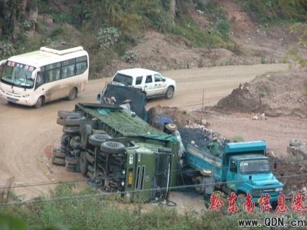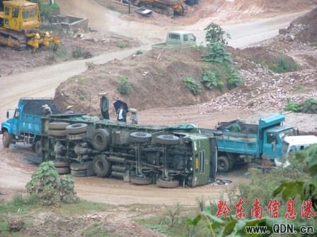 圖片新聞 (張天明 劉征良)10月7日上午,下著蒙蒙細雨,一輛滿運煤炭約30余噸的十二輪大貨運行至凱里鴨塘一路段拐彎處側翻斜躺于路邊,煤面灑滿路坎,車燈、擋風玻璃和車身等受損嚴重,所幸沒有造成人員傷亡。據知情人介紹,該路段為交通事故多發段,目前,該路改直工程正在進行中。