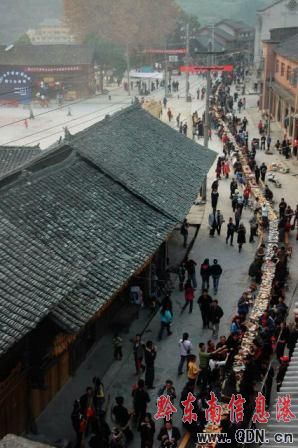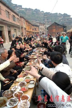 雷山縣西江鎮千戶苗寨苗族同胞于11月11日擺出近200米長的長桌,并在餐桌上擺滿豐盛美食,讓各地游客與當地苗族同胞1000余人共赴長桌宴,歡慶苗年節。(揚光才 特約記者 陳沛亮攝)