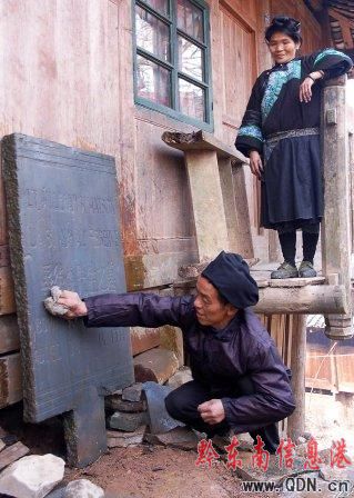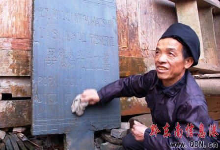 58歲的侗族村民吳老德在擦洗其收藏的刻有中英文字的遇難美軍飛行員的一塊墓碑。