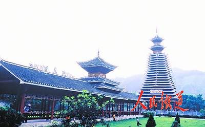 當(dāng)我們走進(jìn)榕江縣三寶侗寨,領(lǐng)略的是另一番美麗景象。進(jìn)得寨來,便踏上卵石鋪就的古道。長長的石路上,是由不同顏色、不同形狀卵石組成的十二生肖圖案,這里人稱為“花街”。抬頭望去,巍然聳立著侗族標(biāo)志性建筑———鼓樓,猶如一棵巨大的杉樹,高大偉岸,美輪美奐。這樣堅固而美麗的建筑,歷數(shù)百年風(fēng)雨而屹然挺立,竟無一釘一鉚,全由木榫、木栓穿合構(gòu)架而成,真可謂神功天造。鼓樓上的楹聯(lián),對仗工整,內(nèi)涵厚重,令人難忘: “秦為荊楚漢屬武陵清列古州萬擔(dān)田疇俗稱三寶侗寨;晨汲渡頭午晌榕蔭暮聆琵琶百世鄉(xiāng)音本是娘美故鄉(xiāng)”,橫批“天下第一侗寨”。沿花街前行,兩棵碩茂的榕樹映入眼簾。你看那樹干粗得要數(shù)人合圍,樹根粗壯裸露,根交錯,枝相連,眼見得“在地愿為連理枝”啊!這樣根深葉茂的大榕樹,綿延榕江岸數(shù)公里竟有190棵之多,系清康熙、雍正年間所植,樹齡已有300年之久。兩棵大榕樹前,一對侗家青年男女的雕像,在向人們吟唱著一支美麗凄婉的愛情之歌。