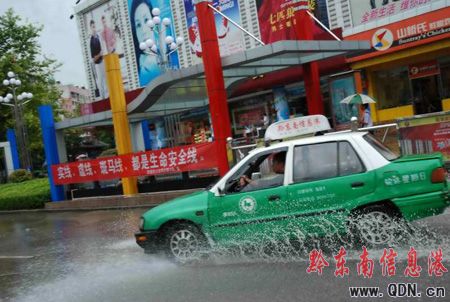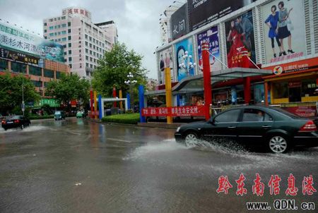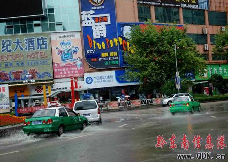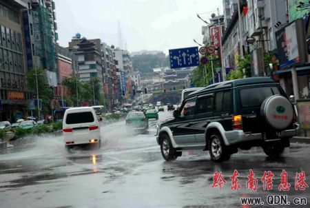 本港訊 (特約記者 陳沛亮) 7月22日,凱里市出現強降天氣,造成城內部分道路積水,給人們出行帶來不便。據氣象部門預計,黔東南州各縣出現暴雨和強降雨天氣。圖為 7月22日,汽車在凱里市大十字路段積水路面上行駛。