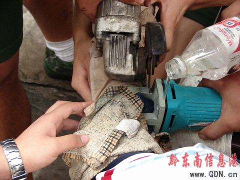 本港訊 9月3日下午,鎮(zhèn)遠縣一名男子在使用鉆孔機鉆木打孔時,因操作不慎,鉆孔機上的固定夾將其左手臂的饑肉緊緊“咬”住,欲罷不能。痛苦萬分的男子遂向消防隊部門求助。趕來的消防隊員用切割機開展施救,經(jīng)20多分鐘努力將鉆孔機固定夾成功切割,男子終獲解困。