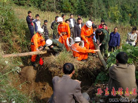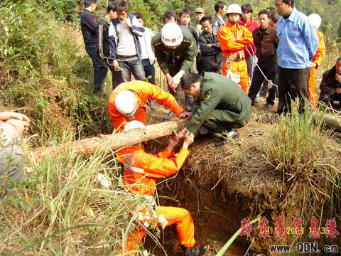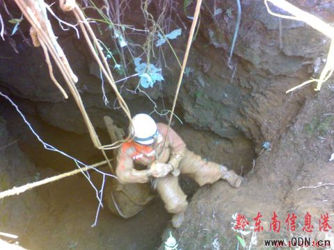 經(jīng)過半個(gè)多小時(shí)的驅(qū)車跋涉,救援人員安全抵達(dá)事故現(xiàn)場(chǎng)。通過詢問在場(chǎng)群眾及主人和堪查,具體情況是兩頭黃牛在打斗過程中掉入30米深洞內(nèi),因主人家的主要經(jīng)濟(jì)收入是靠?jī)深^黃牛維持,在救助小組到達(dá)之前,當(dāng)?shù)氐娜罕娪美K子試圖營(yíng)救,但由于洞口窄小加之對(duì)洞內(nèi)的情況不了解,器材不足,經(jīng)驗(yàn)欠缺,準(zhǔn)備不充分,解救未果。初步情況掌握后,教導(dǎo)員謝元君馬上現(xiàn)場(chǎng)指揮副中隊(duì)長(zhǎng)劉毅對(duì)山洞周圍的情況進(jìn)行勘察,并商量決定采取以往的方式進(jìn)行救援:在洞口處架設(shè)固定木樁固定救生繩,先由中隊(duì)一級(jí)士官王飛配戴好個(gè)人防護(hù)裝備后攜帶救助器材到洞內(nèi)進(jìn)行偵察。該同志下到離地面約15米洞內(nèi)一個(gè)平臺(tái)上進(jìn)行偵察,發(fā)現(xiàn)該洞穴呈S斗狀,一直向下延伸,洞內(nèi)結(jié)構(gòu)復(fù)雜。并深入洞底經(jīng)偵查發(fā)現(xiàn)洞內(nèi)有兩頭黃牛一頭已經(jīng)死亡。偵查人員便向教導(dǎo)員謝元君報(bào)告,洞內(nèi)情況。收到該同志的報(bào)告后,教導(dǎo)員謝元君立刻命令將已經(jīng)死亡的牛先拉上去以便給第二步救援帶來經(jīng)驗(yàn),同時(shí)命令孟宗保下入洞內(nèi)協(xié)助王飛,孟宗保接到命令馬上佩戴好個(gè)人防護(hù)裝備后攜帶安全繩下到了洞底。