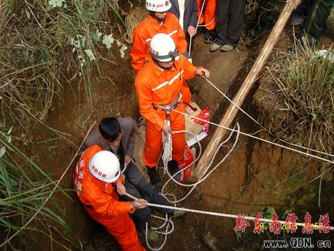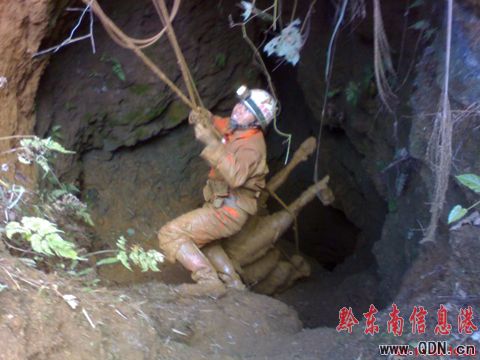 由于洞底是一個(gè)泥塘,在救助小組未到達(dá)現(xiàn)場(chǎng)時(shí)當(dāng)?shù)厝罕娫诰仍臅r(shí)候繩索斷裂使黃牛陷入泥潭這樣給救援工作帶來了一定的捆難。這時(shí)洞下施救的兩名隊(duì)員經(jīng)過短暫的商量后,經(jīng)過20分鐘的努力下終于把繩索捆綁在黃牛身上,救援人員立即用對(duì)講機(jī)通知副中隊(duì)長(zhǎng)劉毅讓上面的人將黃牛拉上去。就在拉的時(shí)候黃牛被卡住在了一個(gè)小的轉(zhuǎn)角處,由于轉(zhuǎn)角口較小小黃牛無法拉上去,救援人員立即向老鄉(xiāng)借來斧頭將轉(zhuǎn)角擴(kuò)寬。經(jīng)當(dāng)?shù)厝罕姾途仍藛T的努力下終于拉出一頭黃牛。有了第一次成功的救援經(jīng)驗(yàn)第二頭黃牛很快的被營(yíng)救回到地面,救援順利完成。