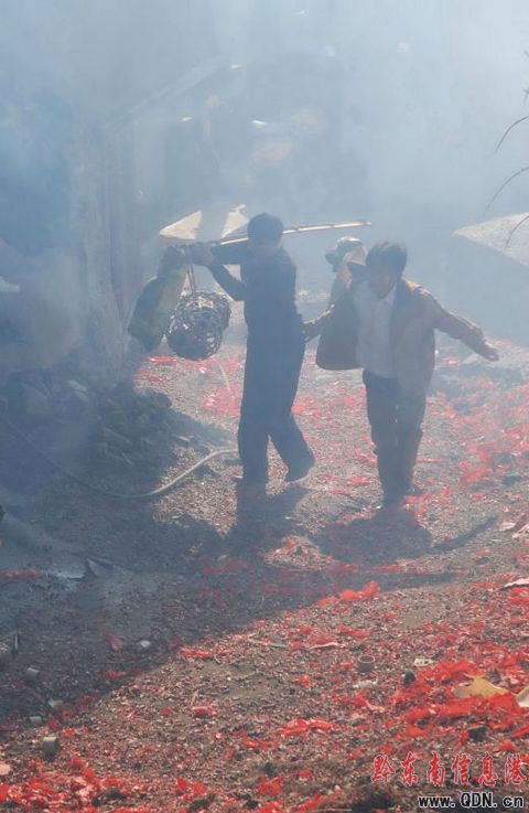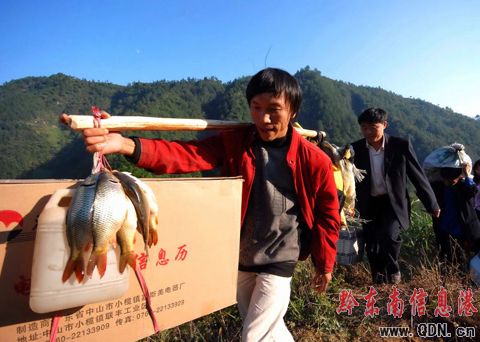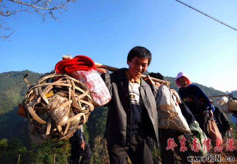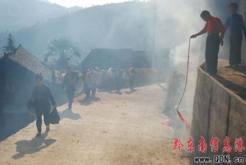 本港訊 (陳沛亮 攝影報道)11月8至19日,凱里市三棵樹鎮大烏燒村苗族同胞舉行13年一次的“牯藏節”,當地家家親友、客人匯聚,舉行11天的隆重祭祀和蘆笙舞等活動。圖為11月8日,苗族同胞挑著禮物到凱里市三棵樹鎮大烏燒村參加“牯藏節”和燃放火炮、宰雞殺鴨招待參加“牯藏節”的客人。