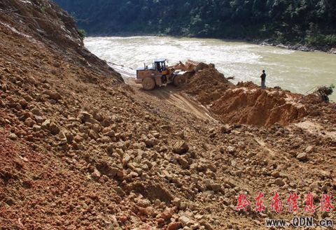 本港訊 (高建層 陳沛亮 攝影報道)榕江縣持續暴雨,境內321國道K998公里+100米處邊坡坍塌發生8000余立方山體滑坡,泥石覆蓋阻塞了100多米長的公路路面,交通中斷,所幸無人員傷亡。 榕江公路管理段迅速啟動緊急預案組織搶修人員和機械進場搶修。截止記者發稿為止,搶修工作仍緊張進行當中。公路搶修部門預計11月10日才能恢復通車。圖為 2008年11月8日,公路搶險人員在321國道榕江段山體滑坡現場清除泥石。