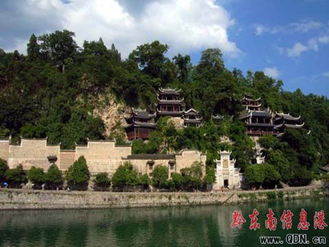 河的背岸山勢奇崛,懸崖峭壁,異巖群生,一座座梵宇亭閣,重樓危殿,參差錯落,貼壁凌空,斷巖對峙,千姿百態的山勢奇絕與山崖渾然一體,云煙繚繞,青翠點染,似入仙境,更若畫簾,不僅使人觀止欲滴也讓世人拍手驚嘆。走進青龍洞古建筑群,更不由得不為古人的卓絕智慧所嘆服。青龍洞古建筑群由藏經樓、大雄寶殿、望星樓、紫陽書院、萬壽宮、六角亭、文公祠等組成,依山勢洞穴錯落而立足,曲徑通幽,蜿蜒盤旋,回廊瓊閣各顯奇妙,挑檐的吊腳樓懸空生根,橫亙斷巖,古樹斜臥蒼崖,虬枝蔬藤纏繞,巨石撐天如柱,如絕如削,晚鐘鳥語清音入耳,側面凌空,下面卻是郁郁蒼蒼的古樹,從十幾丈的翠崖中生長起來,幽得深邃,幽得雋永,卻可望而不可及。絕壁上的通幽小道就像是仙女的腰帶舒暖柔和,走在其間,清寂中也就有了獨自冥思,也就隨性生來的空靈之感。
