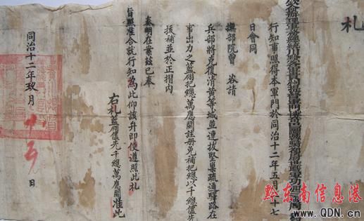 本港訊 三穗縣檔案局在收集錦屏文書工作中,發(fā)現(xiàn)并收藏了一份十分珍貴的清代同治年間官府頒布的清末貴州提督門博奇巴圖魯騎都尉千總?cè)f應(yīng)關(guān)任命書。