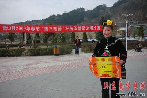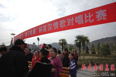 2月8日,為慶祝新聞春佳節,雷山縣當地的苗族同胞與漢族同胞歡聚在一起舉辦苗漢情歌對唱比賽,許多人積極報名參加,氣氛熱鬧非凡,苗漢情歌對唱比賽結束后,并對優勝者進行頒獎