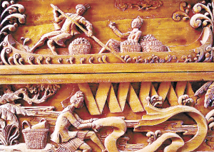 從江侗族鼓樓內富有侗族特色的木雕畫“滿載而歸”和“河邊漂布”。 秦 剛攝