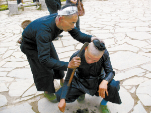 只見一名中年男子將頭浸在一個銅制臉盆里洗了洗,把頭發弄濕,然后在空地中間蹲下,頭頂的發髻沒有打開。這時,一位六七十歲的長者走到他身旁,手里拿著一把鋒利的鐮刀。他將中年男子的頭往左邊按了按,由發髻根部往外,從前額開始朝順時針方向移動。長者剃頭的刀法十分熟練,刀觸發落,頭皮即被刮得光光。十幾分鐘后,那名中年男子便回復到了他應該保持的發式。
