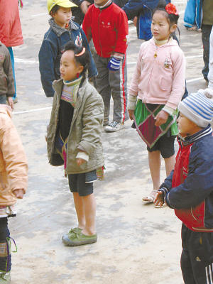操場右角,幾位身著民族服飾的小女生和頭蓄長長發(fā)鬏的小男生格外引人注目。他們大多身穿一兩件單薄衣服,天氣寒冷,孩子們的腳不停地在地上跺,身體也蜷縮成一團(tuán)。讓人驚訝的是,記者竟然看到操場上有不少女孩露著小腿,穿著涼鞋。經(jīng)了解,孩子們身上穿的漢式棉衣基本上都是全國各地好心人捐的;大冷天穿涼鞋是因?yàn)闆]有換洗的球鞋。