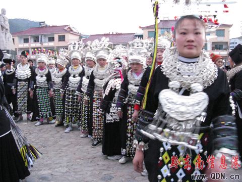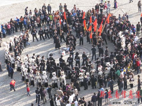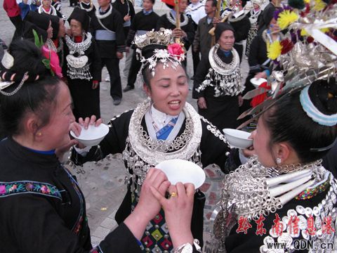 在陽光明媚的臺江城,方召苗族同胞以家族為單位,穿著漂亮的盛裝,吹著蘆笙,浩浩蕩蕩的沿街趕來。一時間,秀眉廣場人頭攢動,人們圍圈翩翩起舞,蘆笙隆隆,歌聲嘹亮。鄉親們自行挑上酒肉擺放在踩鼓場中央,跳累了,就相互對歌敬酒,把一碗晚香甜的米酒一飲而盡,直到一醉方休。漂亮姑娘自成一排,個個打扮得花枝招展,身上的銀飾隨著舞步發出悅耳的響聲。一些游客放下手中的攝像機與姑娘們手拉手跳舞,并不斷的向記者豎起大拇指。苗疆腹地盡歡騰,跳不完的舞,唱不完的歌,喝不盡的酒,萬民同歡,其樂融融。