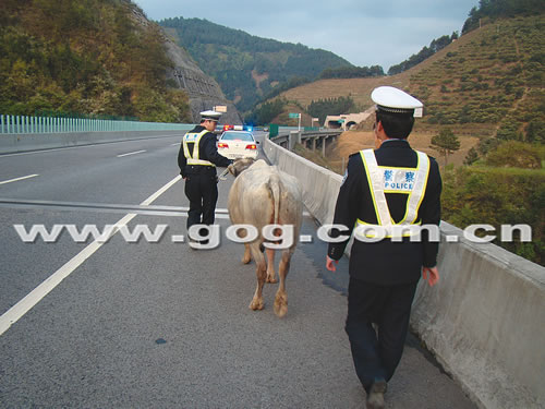 3月30日17時40分,省交警總隊直屬支隊玉凱一大隊巡邏交警楊榮云等巡邏到玉凱高速公路120公里下行線時,發現一頭耕牛在高速公路上行走,交警立即下車,把耕牛趕出了高速公路。