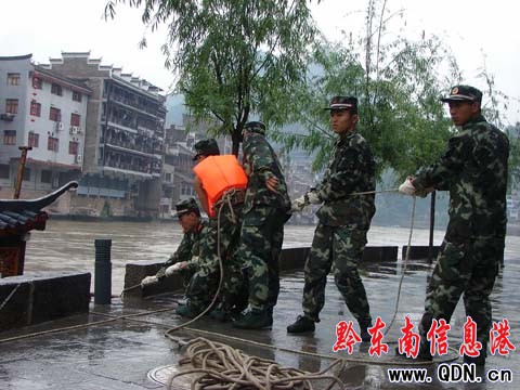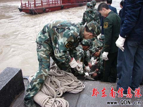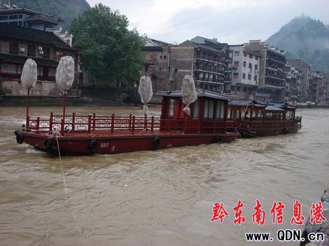 本港訊 (李正迪 攝影報道)19日6時許,鎮遠縣某文化產業公司停放在興隆街河段的兩艘游船由于河水上漲,導致固定船身的部分鋼繩已斷裂,情況危急。接報警后,鎮遠縣消防官兵火速趕往現場排險。經1個多小時的努力,兩艘欲脫韁遇險的游船終被救援人員用綱繩控制住。