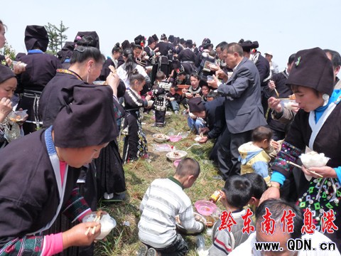 記者看到,大家頂著烈日,在山頂上載歌載舞,共享佳肴,他們有的圍圈起舞,有的三五成群對歌,有的飲酒懷舊,一醉方休。有飛歌唱道:“今朝有緣來相會,明日成雙成對。春暖樹花開,知了唧唧叫,阿哥阿妹上山干活去,來年迎來大豐收。”一時間,隆隆的蘆笙響徹上空,飛歌、酒歌、情歌飄向九霄云外。人們話春耕,談發展,展未來,老人敘舊、青年談情、小孩嬉戲,其樂融融。