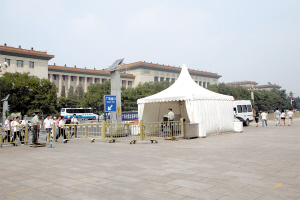 9月2日中午,本報記者前往天安門廣場注意到,唯一能進入廣場的幾個地下通道全部設置了安檢設施。每個地下通道安檢處都站有一名或多名武警,游客隨身所帶所有包物必須接受安檢,確認安全后方能進入廣場參觀。在偌大的廣場上,隨處可見各式警車,武警及民警遍布廣場各個角落,來回在廣場上走動。