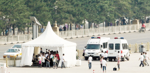 在天安門廣場周邊的長安街等馬路人行道上,背包的游客行人須隨時無條件接受路邊巡邏民警及武警的開包檢查。在天安門城樓西側的中山公園門前,劉姓特警及兩名同事正端著槍全副武裝地站在便道上值勤,密切注視著周邊。三人英俊的外表和颯爽的英姿吸引了不少經過的游客,紛紛要求合影留念,但三人均表示謝絕。